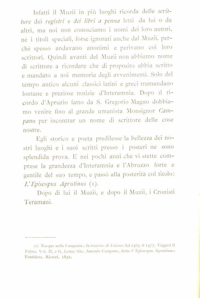 Infatti il Muzii in più luoghi ricorda delle scritture dei registri e dei libri a penna letti da lui o da altri, ma noi non conosciamo i nomi dei loro autori, né i titoli speciali, forse ignorati anche dal Muzii, perchè spesso andavano anonimi e perivano coi loro scrittori. Quindi avanti del Muzii non abbiamo nome di scrittore a ricordare che di proposito abbia scritto e mandato a noi memoria degli avvenimenti. Solo del tempo antico alcuni classici latini e greci tramandano lontane e preziose notizie cl'lnteramnia. Dopo il ricordo d'Apruzio fatto da S. Gregorio Magno dobbiamo venire fino al grande umanista Monsignor Campano per incontrar un nome di scrittore delle cose nostre.