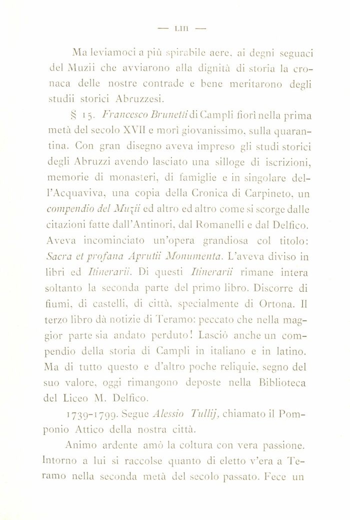 § 15. Francesco Brunetti di Campii fiori nella prima metà del secolo XVII e morì giovanissimo, sulla quarantina. Con gran disegno aveva impreso gli studi storici degli Abruzzi avendo lasciato una silloge di iscrizioni, memorie di monasteri, di famiglie e in singolare del-l'Acquaviva, una copia della Cronica di Carpineto, un compendio del Mu~ii ed altro ed altro come si scorge dalle citazioni fatte dall'Antinori, dal Romanelli e dal Delfico. Aveva incominciato un'opera grandiosa col titolo: Sacra et profana Aprutii Monumenta. L'aveva diviso in libri ed Itinerarii. Di questi Itinerarii rimane intera soltanto la seconda parte del primo libro. Discorre di fiumi, di castelli, di città, specialmente di Ortona. Il terzo libro dà notizie di Teramo: peccato che nella maggior parte sia andato perduto! Lasciò anche un compendio della storia di Campii in italiano e in latino. Ma di tutto questo e d'altro poche reliquie, segno del suo valore, oggi rimangono deposte nella Biblioteca del Liceo M. Delfico.