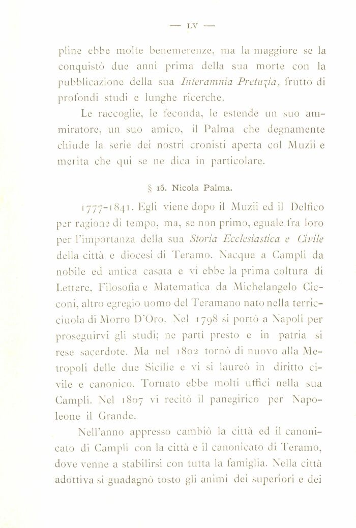 1777-1841. Egli viene dopo il Muzii ed il Delfico per ragione di. tempo, ma, se non primo, eguale fra loro per l'importanza della sua Storia Ecclesiastica e Civile della città e diocesi di Teramo. Nacque a Campii da nobile ed antica casata e vi ebbe la prima coltura di Lettere, Filosofia e Matematica da Michelangelo Cic-coni, altro egregio uomo del Teramano nato nella terric-ciuola di Morro D'Oro. Nel 1798 si portò a Napoli per proseguirvi gli studi; ne partì presto e in patria si rese sacerdote. Ma nel 1802 tornò di nuovo alla Metropoli delle due Sicilie e vi si laureò in diritto civile e canonico. Tornato ebbe molti uffici nella sua Campii. Nel 1807 vi recitò il panegirico per Napoleone il Grande.