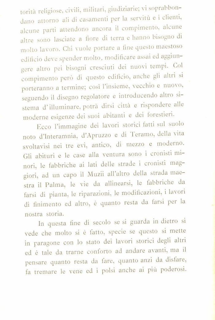 Ecco l'immagine dei lavori storici fatti sul suolo noto d'Interamnia, d'Apruzzo e di Teramo, della vita svoltavisi nei tre evi, antico, di mezzo e moderno. Gli abituri e le case alla ventura sono i cronisti minori, le fabbriche ai lati delle strade i cronisti maggiori, ad un capo il Muzii all'altro della strada maestra il Palma, le vie da allinearsi, le fabbriche da farsi di pianta, le riparazioni, le modificazioni, i lavori di finimento ed altro, è quanto resta da farsi per la nostra storia.