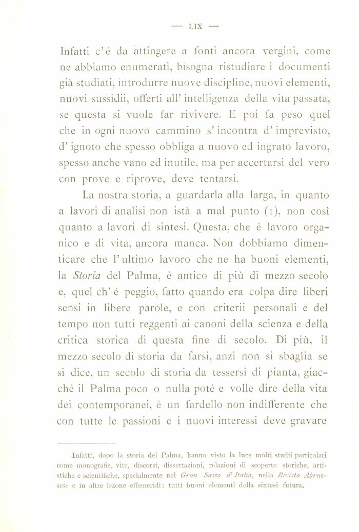 Infatti, dopo la storia del Palma, hanno visto la luce molti studii particolari come monografie, vite, discorsi, dissertazioni, relazioni di scoperte storiche, artistiche e scientifiche, specialmente nel Gran Sasso d'Italia, nella Rivista Abruzzese e in altre buone effemeridi : tutti buoni elementi della sintesi futura.