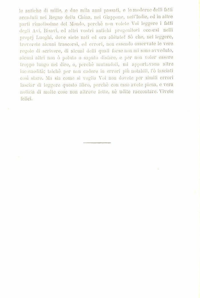 le antiche di mille, e duo mila anni passati, e le moderne delli fatti accaduti nel Regno della China, nei Giappone, nell'Indie, ed in altre parti rimotissime del Mondo, perchè non volete Voi leggere i fatti degli Avi, Bisavi, ed altri vostri antichi progenitori occorsi nelli propr.j Luoghi, dove siete nati ed ora abitate? Sò che, nel leggere, troverete alcuni trascorsi, ed errori, non essendo osservate lo vere regole di scrivere, di alcuni delli quali forse non mi sono avveduto, alcuni altri non ù potuto o saputo disfare, e per non voler essere troppo lungo nel dire, o, perchè mutandoli, mi apportavano altre incomodità; talché per non cadere in errori più notabili, l'ò lasciati così stare. Ma sia come si voglia Voi non dovete per simili errori lasciar di leggere questo libro, perchè con esso avete piena, e vera notizia di molte cose non altrove lette, nè udite raccontare. Vivete felici.