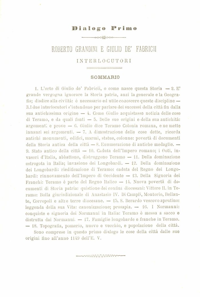 1. L'orto di Giulio de' Fabricii, o come nasce questa Storia 2. E' grande vergogna ignorare la Storia patria, anzi la generale e la Geografa; disdice alla civiltà: è necessario ed utile conoscere queste discipline 3.1 due interlocutori s'intendono per parlare dei successi della città fin dalla sua antichissima origine 4. Come Giulio acquistasse notizia delle cose di Teramo, e da quali fonti 5. Delle sue origini e della sua antichità: argomenti e prove G. Giulio dice Teramo Colonia romana, e ne mette innanzi sei argomenti. 7. A dimostrazione delle cose dette, ricorda antichi monumenti, edifici, marmi, statue, colonne: povertà di documenti della Storia antica della città 8. Enumerazione di antiche medaglie. 9. Stato antico della città 10. Caduta dell'Impero romano; i Goti, invasori d'Italia, abbattono, distruggono Teramo 11. Della dominazione ostrogota in Italia; invasione dei Longobardi. 12. Della dominazione dei Longobardi: riedificazione di Teramo: caduta del Regno dei Longobardi: rinnovamento dell'Impero di Occidente 13. Della Signoria dei Franchi: Teramo é parte del Regno Italico 14. Nuova povertà di documenti di Storia patria: quistione dei contini diocesani: Vittore lì. in Teramo: Bolla giurisdizionale di Anastasio IV. Di Campii, Molitorio, Bellan-te, Corropoli e altre terre diocesane. 15. S. Berardo vescovo aprutino: leggenda della sua Vita: canonizzazione; prosapia. 16. I Normanni: conquiste e signoria dei Normanni in Italia: Teramo è messa a sacco e distrutta dai Normanni. 17. Famiglie longobarde e franche in Teramo. 18. Topografia, pomerio, nuovo e vecchio, e popolazione della città.