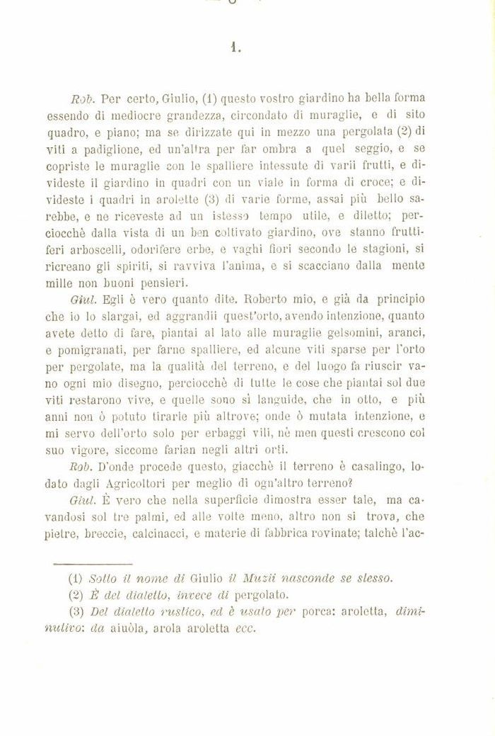 Rob. Per certo, Giulio, (1) questo vostro giardino ha bella forma essendo di mediocre grandezza, circondato di muraglie, e di sito quadro, e piano; ma se dirizzate qui in mezzo una pergolata (2) di viti a padiglione, ed un'altra per far ombra a quel seggio, e se copriste le muraglie con le spalliere intessute di varii frutti, e divideste il giardino in quadri con un viale in forma di croce; e divideste i quadri in arolette (3) di varie forme, assai più bello sarebbe, e ne riceveste ad un istesso tempo utile, e diletto; perciocché dalla vista di un ben coltivato giardino, ove stanno fruttiferi arboscelli, odorifere erbe, e vaghi fiori secondo le stagioni, si ricreano gii spiriti, si ravviva l'anima, e si scacciano dalla mente mille non buoni pensieri.