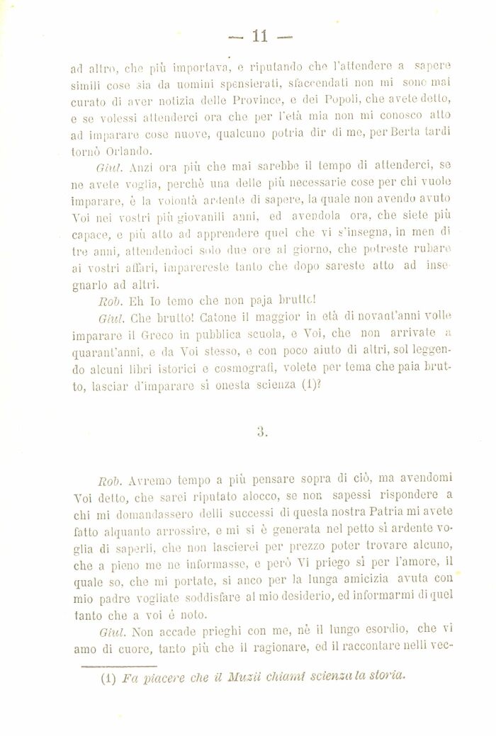 Giul. Che brutto! Catone il maggior in età di novanl'anni volle imparare il Greco in pubblica scuola, e Voi, che non arrivate a quarant'anni, e da Voi stesso, e con poco aiuto di altri, sol leggendo alcuni libri istorici e cosmografi, volete per tema che paia brutto, lasciar d'imparare si onesta scienza (1)?