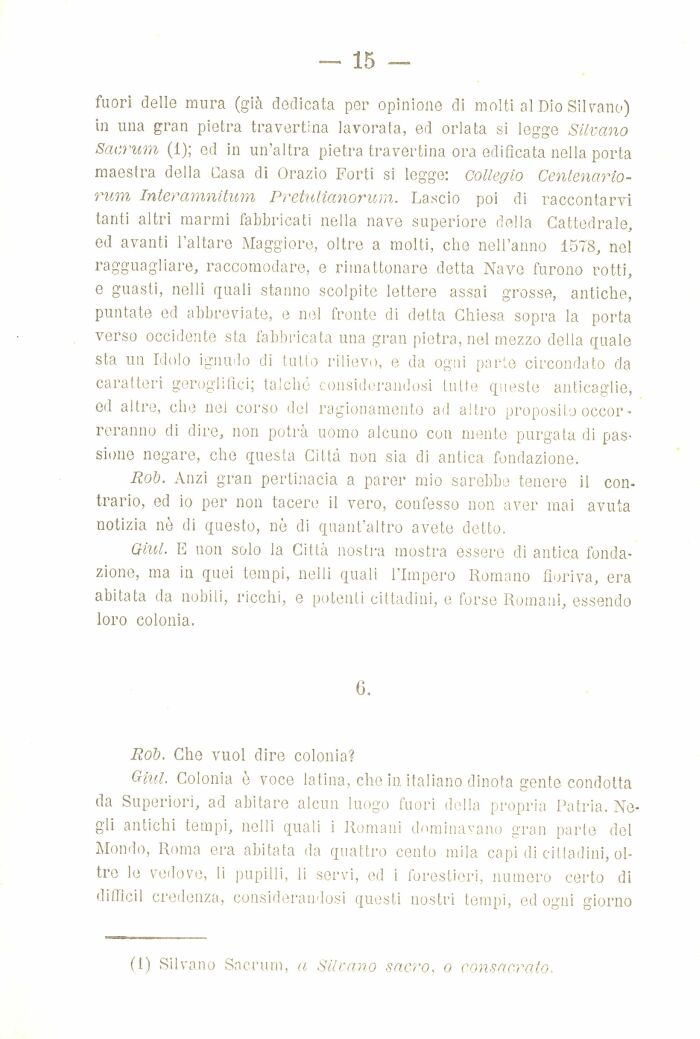 fuori delle mura (già dedicata per opinione di molti al Dio Silvano) in una gran pietra travertina lavorata, ed orlata si legge Silvano Sacrum (1); ed in un'altra pietra travertina ora edificata nella porta maestra della Casa di Orazio Forti si legge: Collegio Centenario-rum Interamnitum Pretulianorum. Lascio poi di raccontarvi tanti altri marmi fabbricati nella nave superiore della Cattedrale, ed avanti l'altare Maggiore, oltre a molti, che nell'anno 1578, nel ragguagliare, raccomodare, e rimattonare detta Nave furono rotti, e guasti, nelli quali stanno scolpite lettere assai grosse, antiche, puntate ed abbreviate, e nel fronte di detta Chiesa sopra la porta verso occidente sta fabbricata una gran pietra, nel mezzo della quale sta un Idolo ignudo di tutto rilievo, e da ogni parte circondato da caratteri geroglifici; talché considerandosi tulle queste anticaglie, ed altro, che nel corso del ragionamento ad altro proposito occorreranno di dire, non potrà uomo alcuno con niente purgata di passione negare, che questa Città non sia di antica fondazione.