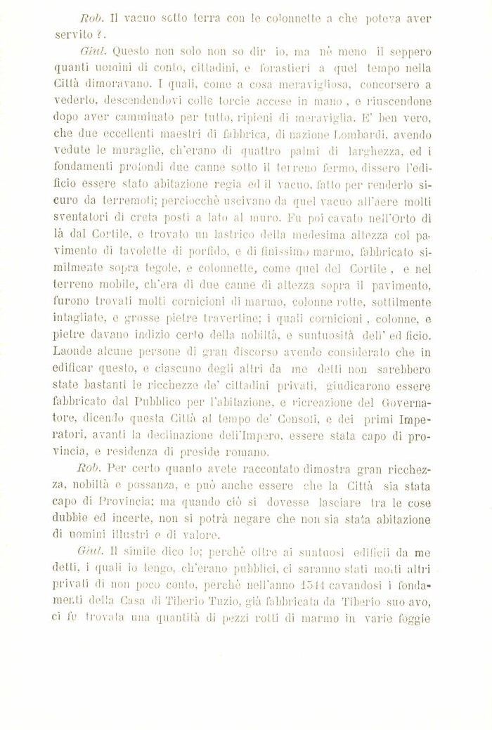 Glul. Il simile dico io; perchè oltre ai suntuosi edificii da me detti, i quali io tengo, ch'erano pubblici, ci saranno siati moili altri privati di non poco conto, perchè nell'anno 1511 cavandosi i fondamenti della Casa di Tiberio Tuzio, già fabbricata da Tiberio suo avo, ci fu trovala una quantità di pezzi rolli di marmo in. varie foggie