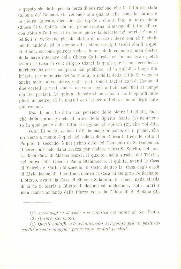 e questo sia detto per Ja terza dimostrazione, che la Città sia slata Colonia de' Romani. Or venendo alla quarta, che sono le statue, e le pietre figurate, dico che già sapete , che al lato al muro della Chiesa di S. Spirito sta una grande statua di marmo di tutto rilievo con abito all'antica, ed in molte pietre fabbricate nei muri de' nuovi edificii si vedevano piccole statue di mezzo rilievo con abiti similmente antichi, ed in alcune altre stanno scolpili trofei simili a quei di Roma, siccome potrete vedere in una delle colonne a man destra della nave inferiore della Chiesa Cattedrale, ed in una gran pietra avanli la Casa di Gio: Filippo Cianci, la quale per la sua eccellenza meriterebbe esser comprata dal pubblico, ed in pubblico luogo fabbricata per memoria dell'antichità, e nobiltà della Città. Si veggono anche molte altre pietre, delle quali sono intagliati capi di Fauno, li due cortelli e vasi, che si usavano negli antichi sacriflcii al tempo dei Dei profani. La quinta dimostrazione sono li molti epitaffi intagliali in pietre, ed in marmi con lettere antiche, e nomi degli antichi romani.