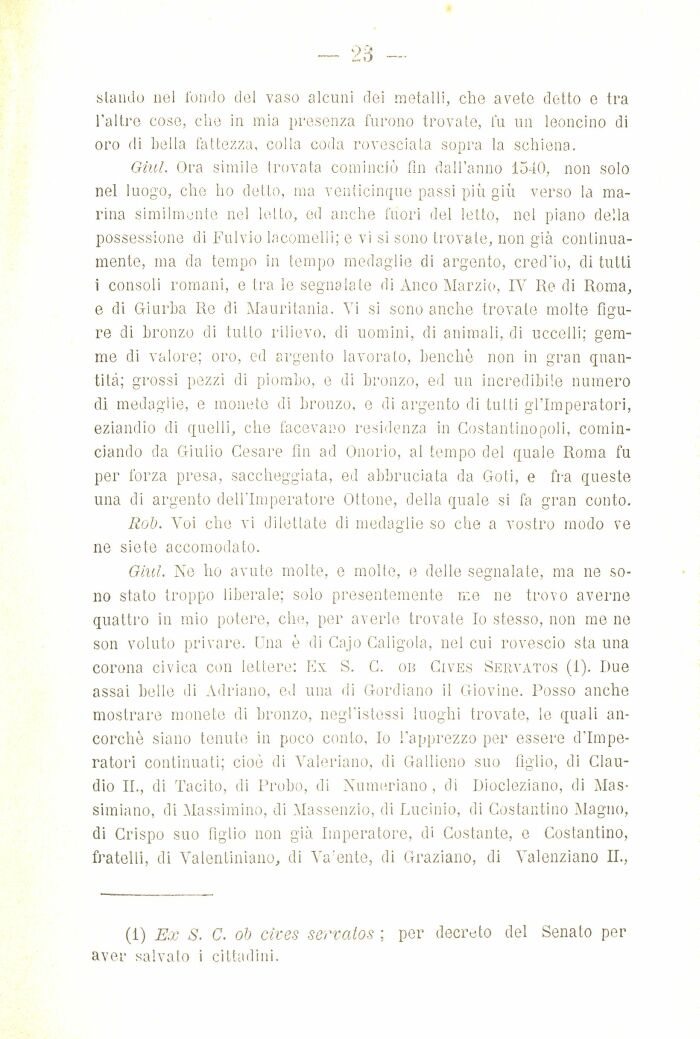 Giul. Ne ho avute molte, e molte, e delle segnalate, ma ne sono stato troppo liberale; solo presentemente me ne trovo averne quattro in mio potere, che, per averle trovate Io stesso, non me ne son voluto privare. Una è di Cajo Caligola, nel cui rovescio sta una corona civica con lettere: Ex S. C. ob Cives Servatos (1). Due assai beile di Adriano, ed una di Gordiano il Giovine. Posso anche mostrare monete di bronzo, negi'istessi luoghi trovate, le quali ancorché siano tenute in poco conto, Io l'apprezzo per essere d'Imperatori continuati; cioè di Valeriano, di Gallieno suo figlio, di Claudio IL, di Tacito, di Probo, di Nutneriano, di Diocleziano, di Massimiano, di Massimino, di Massenzio, di Lucinio, di Costantino Magno, di Crispo suo figlio non già Imperatore, di Costante, e Costantino, fratelli, di Valenliniano, di Va'ente, di Graziano, di Valenziano II.,