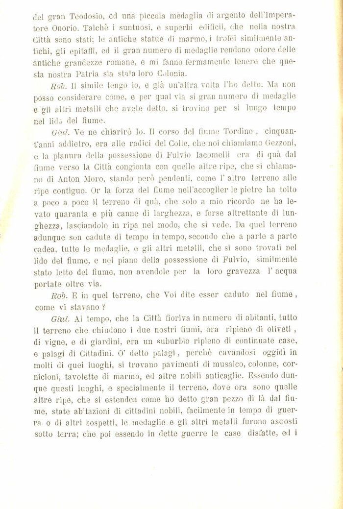 Giul. Ve ne chiarirò Io. Il corso del fiume Torci ino , cinquan-t'anni addietro, era alle radici del Colle, che noi chiamiamo Gezzoni, e la pianura della possessione di Fulvio Iacomelli era eli quà dal fiume verso la Città congionta con quelle altre ripe, che si chiamano di Anton Moro, stando però pendenti, come 1' altro terreno alle ripe contiguo. Or la forza del fiume nell'accoglier le pietre ha tolto a poco a poco il terreno di quà, che solo a mio ricordo ne ha levato quaranta e più canne di larghezza, e forse altrettante di lunghezza, lasciandolo in ripa nel modo, che si vede. Da quel terreno adunque soli cadute di tempo in tempo, secondo che a parte a parte cadea, tutte le medaglie, e gli altri metalli, che si sono trovati nel lido del fiume, e nel piano della possessione di Fulvio, similmente stato letto del fiume, non avendole per la loro gravezza 1' acqua portate oltre via.