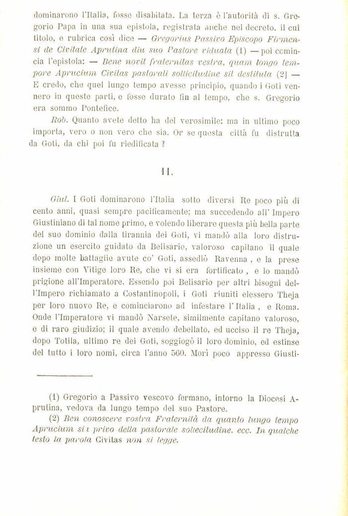 dominarono l'Italia, fosse disabitata. La terza è l'autorità di s. Gregorio Papa in una sua epistola, registrata anche nel decreto, il cui titolo, e rubrica così dice Gregorius Passivo Episcopo Firmen-si de Civitate Aprutina diu suo Pastore viduaia (1) poi comincia l'epistola: Bene novit fralernitas vestra, quam longo tempore Aprucium Civitas pastorali soliicitudine sit destituía (2J E credo, che quel lungo tempo avesse principio, quando i Goti vennero in queste parti, e fosse durato fin al tempo, che s. Gregorio era sommo Pontefice.