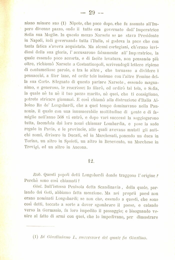niano minore suo (1) Nipote, che poco dopo, che fu assunto all'Impero divenne pazzo, onde il tutto era governato dall' Imperatrice Sofia sua Moglie. In questo mezzo Narsete se ne stava Presidente in Napoli, indi governando tutta l'Italia, si godeva la pace che con tanta fatica s'aveva acquistata. Ma alcuni cortegiani, ch'erano invidiosi della sua gloria, 1' accusarono falsamente ali' Imperatrice, la quale essendo poco accorta, e di facile levatura, non pensando più oltre, richiamò Narsete a Costantinopoli, scrivendogli lettere ripiene di contumeliose parole, e tra le altre , che tornasse a dividere i pennacchi, a filar lane, ed ordir tele insieme con l'altre Femine della sua Corte. S legnato di questo parlare Narsete, essendo magnanimo, e generoso, le rescrisse: Io tìlarò, ed ordirò tal tela, o Sofia, la quale nè tu nò il tuo pazzo marito, nè quei, che ti consigliano, potrete stricare giammai. E cosi chiamò alla distruzione d'Italia Alboino Re de' Longobardi, che a quel tempo dominavano nella Pan-nonia, il quale con una innumerabile moltitudine di gente e di famiglie nell'anno 508 vi entrò, e dopo vari successi la soggiogarono tutta, facendola dai loro nomi chiamar Lombardia, e pose la sede regale in Pavia, e le provincie, alle quali avevano mutali gli antichi nomi, divisero in Ducati, ed in Marchesati, ponendo un duca in Torino, un altro in Spoleti, un altro in Benevento, un Marchese in Trevigi, ed un altro in Ancona.