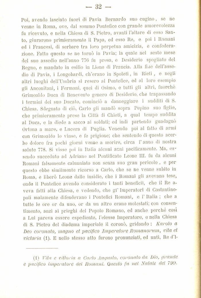 Poi, avendo lasciato fuori di Pavia Bernardo suo cugino, se ne venne in Roma, ove, dal sommo Pontefice con grande amorevolezza fu ricevuto, e nella Chiesa di S. Pietro, avanti l'altare di esso Santo, giurarono primieramente il Papa, ed esso Re, e poi i Romani ed i Francesi, di serbare tra loro perpetua amicizia, e confederazione. Fatto questo se ne tornò in Pavia; la quale nel sesto mese del suo assedio nell'anno 776 fu presa, e Desiderio spogliato del Regno, e mandato in esilio in Lione di Francia. Alla fine dell'assedio di Pavia, i Longobardi, ch'erano in Spoleti, in Rieti , e negli altri luoghi dell'Umbria si resero al Pontefice, ed al loro esempio gli Anconitani, i Fermani, quei di Osimo, e tutti gli altri, fuorché Grimoaldo Duca di Benevento genero di Desiderio, che trapassando i termini del suo Ducato, cominciò a danneggiare i sudditi di S. Chiesa. Sdegnato di ciò, Carlo gli mandò sopra Pepino suo figlio, che primieramente prese la Città di Chieti, a qual tempo suddita al Duca, e la diede a sacco ai soldati; ed indi partendo guadagnò Ortona a mare, e Lucerà di Puglia. Venendo poi al fatto di armi con Grimoaldo lo vinse, e fé prigione; che sentendo di questo acerbo dolore fra pochi giorni venne a morire, circa 1' anno di nostra salute 778. Si visse poi in Italia alcuni anni pacificamente. Ma, essendo succeduto ad Adriano nel Pontificato Leone III. fu da alcuni Romani falsamente calunniato non senza suo gran pericolo , e per questo ebbe similmente ricorso a Carlo, che se ne venne subito in Roma, e liberò Leone dalle insidie, che i Romani gli avevano tese, onde il Pontefice avendo considerato i tanti beneficii, che il Re a-veva fatti alla Chiesa, e vedendo, che gf Imperatori di Costantinopoli malamente difendevano i Pontefici Romani, e 1' Italia ; che a tutte le ore or da uno, or da un altro erano molestati; con consentimento, anzi ai prieghi del Popolo Romano, ed anche perché così a Lui pareva essere espediente, l'elesse Imperatore, e nella Chiesa di S. Pietro del diadema imperiale il coronò, gridando : Karolo a Deo coronato, magno et pacifico Imperatore Romanorum, vita et Victoria (1). E nello stesso atto furono pronunziati, ed unti, Re d'1-