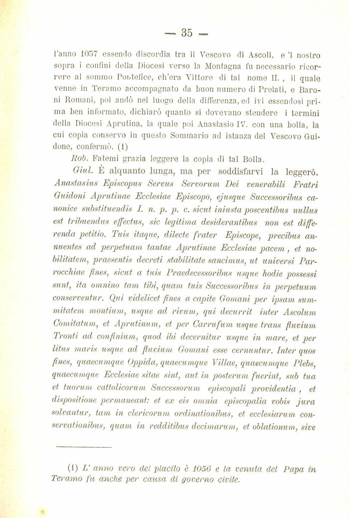 l'anno 1057 essendo discordia tra il Vescovo di Ascoli, e '1 nostro sopra i confini della Diocesi verso la Montagna fu necessario ricorrere al sommo Pontefice, ch'era Vittore di tal nome II. , il quale venne in Teramo accompagnato da buon numero di Prelati, e Baroni Romani, poi andņ nel luogo della differenza, ed ivi essendosi prima ben informato, dichiarņ quanto si dovevano stendere i termini della Diocesi Aprutina, la quale poi Anastasio IV. con una bolla, la cui copia conservo in questo Sommario ad istanza del Vescovo Guidone, confermņ. (1)