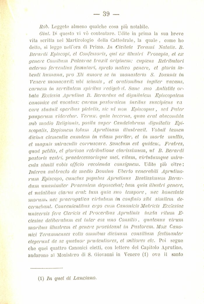 Giul. Di questo vi vò contentare. Udite in prima la sua breve vita scritta nel Martirologio della Cattedrale, la quale , come ho detto, si legge nell'ora di Prima. In Cimiate Terami Natalis. B. Berarcli Episcopi, el Confessoris, qui ex illustri Prosapia, et ex genere Comitum Palearae traxit originem: cupiens Retributori aeterno ferventius familiari, spreto nativo genere, et gloria la-benti fiumana, pro Xli amore se in monasterio S. Ioannis in Venere monacava: ubi ieiunis, et orationibus iugiler vacans, cameni in servitutem spirilus redigeb il. Sane suo Antistite orbata Ecclesia Aprutina B. Berardus ad dignitalem Episcopalem canonice est vocatus: cur am, pastoralem invitus suscipiens va care studuit operibus pielatis, sic ut non Episcopus, sed Pater pauperum videretur. Verum quia lucerna, quae erat abscondlta sub modio Religionis, posila super Candelabrum dignitatis Epi-scopalis, Regionem totani Aprutinam illustrava. Voluit tamen divina dementia eumdem in vitam pariter, et in morte multis, et magnis miraculis corruscare. Sanctum est quidem, Fratres, quocl petitis, et, gloriosa retribuitone clarissimum, ut B. Berardi pastoris vestri, praedecessorisque mei, vii,am, virtutumque miranda simili vobis officio recolenda consignem. Udite più oltre : Inlerea sultracto de medio Domino Uberto venerabili Aprutino-rum Episcopo, cunctus populus Aprutinus Beatissimum Berar-dum unanimiler Praesulem deposcebat; tum quia illustri genere, el naialibus clarus erat: tum quia suo tempore, nec honestale morum, nec praerogativa virtutum in conflnio sibi similem de-cernebant. Convenienlibus ergo cum Canonicis Matricis Ecclesiae universis fere Clericis et Proceribus Aprutinis iuxta rilum E-clesiae deliberatum est Inter eos uno Consilio, quatenus vir um moribus illustrem et genere provideant in Pastorem. Mox Canonici Teramnenses votis omnibus divinum consilium festinanter elegerunt de se quatuor prudentiores, et miliores etc. Poi segue che quei quattro Canonici eletti, con lettere del Capitolo Aprutino, andarono al Monistero di S. Giovanni in Venere (1) ove il santo