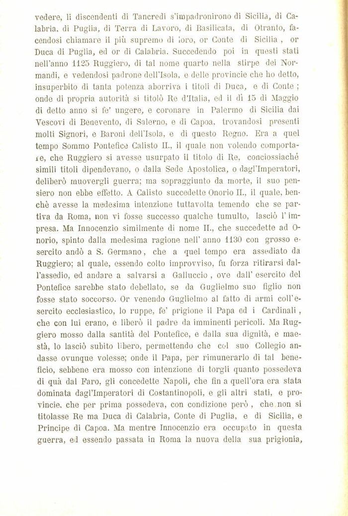vedere, li discendenti di Tancredi s'impadronirono di Sicilia, di Calabria, di Puglia, di Terra di Lavoro, di Basilicata, di Otranto, facendosi chiamare il più supremo di ioro, or Conte di Sicilia , or Duca di Puglia, ed or di Calabria. Succedendo poi in questi stati nell'anno 1125 Ruggiero, di tal nome quarto nella stirpe dei Normandi, e vedendosi padrone dell'Isola, e delle provincie che ho detto, insuperbito di tanta potenza aborriva i titoli di Duca, e di Conte ; onde di propria autorità si titolò Re d'Italia, ed il dì 15 di Maggio di detto anno si fe' ungere, e coronare in Palermo di Sicilia dai Vescovi di Benevento, di Salerno, e di Capoa. trovandosi presenti molti Signori, e Baroni dell'Isola, e di questo Regno. Era a quel tempo Sommo Pontefice Calisto II., il quale non volendo comportale, che Ruggiero si avesse usurpato il titolo di Re, conciossiaché simili titoli dipendevano, o dalla Sede Apostolica, o dagl'Imperatori, deliberò muovergli guerra; ma sopraggiunto da morte, il suo pensiero non ebbe effetto. A Calisto succedette Onorio II., il quale, benché avesse la medesima intenzione tuttavolta temendo che se partiva da Roma, non vi fosse successo qualche tumulto, lasciò l'impresa. Ma Innocenzio similmente di nome II., che succedette ad 0-norio, spinto dalla medesima ragione nell' anno 1130 con grosso e-sercito andò a S. Germano, che a quel tempo era assediato da Ruggiero; al quale, essendo colto improvviso, fu forza ritirarsi dall'assedio, ed andare a salvarsi a Galluccio , ove dall' esercito del Pontefice sarebbe stato debellato, se da Guglielmo suo figlio non fosse stato soccorso. Or venendo Guglielmo al fatto di armi coll'e-sercito ecclesiastico, Io ruppe, fe' prigione il Papa ed i Cardinali , che con lui erano, e liberò il padre da imminenti pericoli. Ma Ruggiero mosso dalla santità del Pontefice, e dalla sua dignità, e maestà, lo lasciò subito libero, permettendo che col suo Collegio andasse ovunque volesse; onde il Papa, per rimunerarlo di tal beneficio, sebbene era mosso con intenzione di torgli quanto possedeva di quà dal Faro, gli concedette Napoli, che fin a quell'ora era stata dominata dagl'Imperatori di Costantinopoli, e gli altri stati, e Provincie, che per prima possedeva, con condizione però , che non si titolasse Re ma Duca di Calabria, Conte di Puglia, e di Sicilia, e Principe, di Capoa. Ma mentre Innocenzio era occupato in questa guerra, ed essendo passata in Roma la nuova della sua prigionia,