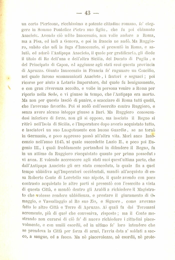un certo Pierleone, ricchissimo e potente cittadino romano, fe' eleggere in Sommo Pontefice Pietro suo figlio, che fu poi chiamato Anacleto. Avendo cị udito Innocenzio, non volle andare a Roma, ma a Pisa, ed indi a Genova, e poi in trancia ne anḍ. Ma Ruggiero, subito che ud́ la fuga d'Innocenzio, si presenṭ in Roma, e saluṭ, ed adoṛ l'Antipapa Anacleto, il quale per gratificarlo, gli diede il titolo di Re dell'una e dell'altra Sicilia, del Ducato di Puglia , e del Principato di Gapoa, ed aggiunse agli stati suoi questa provincia di Apruzzo. Giunto Innocenzio in Francia fe' ragunare un Concilio, nel quale furono scommunicati Anacleto , i fautori e seguaci ; poi ricorse per aiuto a Lotario Imperatore, dal quale fu benignamente, e con gran riverenza accolto, e volle in persona venire a Roma per riporlo nella Sede, e vi giunse in tempo, che l'Antipapa era morto. Ma non per questo lascị di punire, e scacciare di Roma tutti quelli, che l'avevano favorito. Poi si anḍ coll'esercito contro Ruggiero, e senza avere alcuno intoppo'giunse a Bari. Ma Ruggiero conoscendosi inferiore di forze, non gli si oppose, ma lasciato il Regno si ritiṛ nell'Isola di Sicilia, e l'Imperatore dopo averlo acquistato tutto, e lasciatovi un suo Luogotenente con buone Guardie, se ne torṇ in Germania, e poco appresso pasṣ all'altra vita. Moŕ anco Innocenzio nell'anno 1145, al quale succedette Luzio II.. e poco poi Eugenio III., i quali freddamente portandosi in difendere il Regno, fu in un attimo da Ruggiero riacquistato quanto per prima posseduti vi avea. E volendo accrescere agli stati suoi quest'ultima parte, che dall'Antipapa Anacleto gli era stata conceduta, la quale fin a quel tempo ubbidiva agl'Imperatori occidentali, manḍ all'acquisto di essa Roberto Conte di Loretello suo nipote, il quale avendo con poco contrasto acquistato le altre parti si presenṭ con l'esercito a vista di questa Città, e manḍ dentro gli Araldi a richiedere il Magistrato che volesse rendere ubbidienza, e prestare il giuramento di 0-maggio, e Vassallaggio al Re suo Zio, e Signore , come avevano fatto le altre Città e Terre di Apruzzo. Ai quali fu dai Teramani acremente, più di quel che conveniva, risposto ; ma il Conte mostrando non curarsi di cị fe' di nuovo richiedere i cittadini piacevolmente, e con umili esordii, ed in ultimo fe' loro intendere che se prendeva la Città per forza di armi, l'avria data a' soldati a sacco, a sangue, ed a fuoco. Ma nè piacevolezze, nè esordii, nè prote-