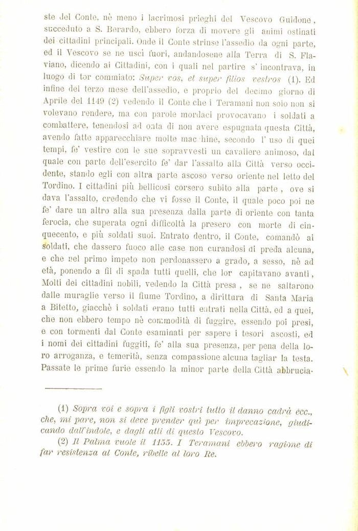 ste del Conte, nè meno i lacrimosi prieghi del Vescovo Guidone , succeduto a S. Berardo, ebbero forza di movere gli animi ostinati dei cittadini principali. Onde il Conte strinse l'assedio da ogni parte, ed il Vescovo se ne uscì fuori, andandosene alla Terra di S. Fla-viano, dicendo ai Cittadini, con i quali nel partire s' incontrava, in luogo di tor commiato: Super vos, et super filios vestros (1). Ed infine del terzo mese dell'assedio, e proprio del decimo giorno di Aprile del 1149 (2) vedendo il Conte che i Teramani non soio non si volevano rendere, ma con parole mordaci provocavano i soldati a combattere, tenendosi ad onta di non avere espugnata questa Città, avendo fatte apparecchiare molte mac bine, secondo f uso di quei tempi, fe' vestire con le sue sopravvesti un cavaliere animoso, dal quale con parte dell'esercito fe' dar l'assalto alla Città verso occidente, stando egli con altra parte ascoso verso oriente nel letto del Tordino. I cittadini più bellicosi corsero subito alla parte , ove si dava l'assalto, credendo che vi fosse il Conte, il quale poco poi ne fe' dare un altro alla sua presenza dalla parte di oriente con tanta ferocia, che superata ogni difficoltà la presero con morte di cinquecento, e più soldati suoi. Entrato dentro, il Conte, comandò ai soldati, che dassero fuoco alle case non curandosi di preda alcuna, e che nel primo impeto non perdonassero a grado, a sesso, nè ad età, ponendo a fil di spada tutti quelli, che lor capitavano avanti, Molti dei cittadini nobili, vedendo la Città presa , se ne saltarono dalle muraglie verso il fiume Tordino, a dirittura di Santa Maria a Bitetto, giacché i soldati erano tutti entrati nella Città, ed a quei, che non ebbero tempo nè corcmodità di fuggire, essendo poi presi, e con tormenti dal Conte esaminati per sapere i tesori ascosti, ed i nomi dei cittadini fuggiti, fe' alla sua presenza, per pena della loro arroganza, e temerità, senza compassione alcuna tagliar la testa. Passate le prime furie essendo la minor parte della Città abbrucia-