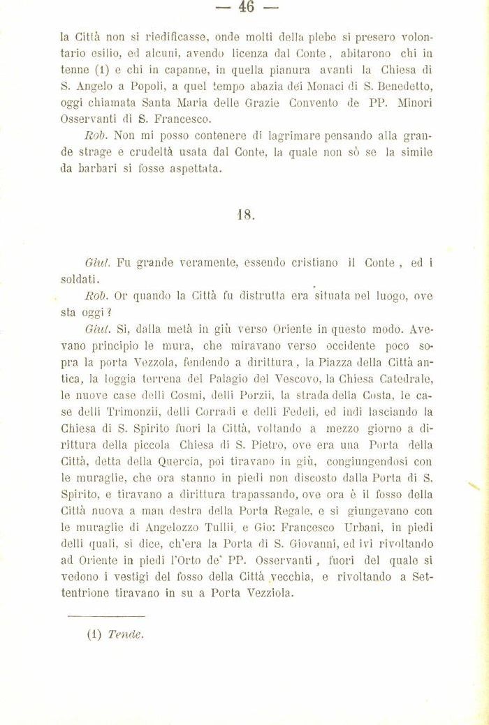 Giul. Si, dalla metà in giù verso Oriente in questo modo. Avevano principio le mura, che miravano verso occidente poco sopra la porta Vezzola, fendendo a dirittura, la Piazza della Città antica, la loggia terrena del Palagio del Vescovo, la Chiesa Catedrale, le nuove case del li Cosmi, delli Porzii, la strada della Costa, le case delti Trimonzii, delli Corradi e delli Fedeli, ed indi lasciando la Chiesa di S. Spirito fuori la Città, voltando a mezzo giorno a dirittura della piccola Chiesa di S. Pietro, ove era una Porta della Città, detta della Quercia, poi tiravano in giù, congiungendosi con le muraglie, che ora stanno in piedi non discosto dalla Porta di S. Spirito, e tiravano a dirittura trapassando, ove ora è il fosso della Città nuova a man destra della Porta Regale, e si giungevano con le muraglie di Angelozzo Tullii, e Gio: Francesco Urbani, in piedi delli quali, si dice, ch'era la Porta di S. Giovanni, ed ivi rivoltando ad Oriente in piedi l'Orto de' PP. Osservanti , fuori del quale si vedono i vestigi del fosso della Città vecchia, e rivoltando a Settentrione tiravano in su a Porta Vezziola.