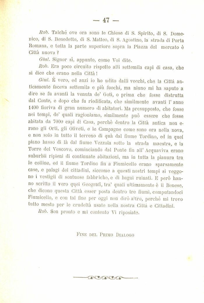 Giul. È vero, ed anzi io ho udito dalli vecchi, che la Città anticamente taceva settemila e più fuochi, ma niuno mi ha saputo a dire se fu avanti la venuta de' Goti, o prima che fosse distrutta dal Conte, e dopo che fu riedificata, che similmente avanti 1' anno 1400 fioriva di gran numero di abitatori. Ma presupposto, che fosse nei tempi, de' quali ragioniamo, similmente può essere che fosse abitata da 7000 capi di Casa, perchè dentro la Città antica non e-rano gli Orli, gli Oliveti, e le Campagne come sono ora nella nova, e non solo in tutto il terreno di qua dal fiume Tordino, ed in quel piano basso di là dal fiume Yezzola sotto la strada maestra, e la Torre del Vescovo, cominciando dal Ponte fin all' Acquaviva erano suburbii ripieni di continuate abitazioni, ma in tutta la pianura tra le colline, ed il fiume Tordino fin a Fiumicello erano sparsamente case, e palagi dei cittadini, siccome a questi nostri tempi si veggono i vestigli di sontuose fabbriche, e di bagni ruinati. E però hanno scritto il vero quei Geografi, tra' quali ultimamente è il Betiese, che dicono questa Città esser posta dentro tre fiumi, computandoci Fiumicello, e con tal fine per oggi non dirò altro, perché mi trovo tutto mesto per le crudeltà usate nella nostra Città e Cittadini.