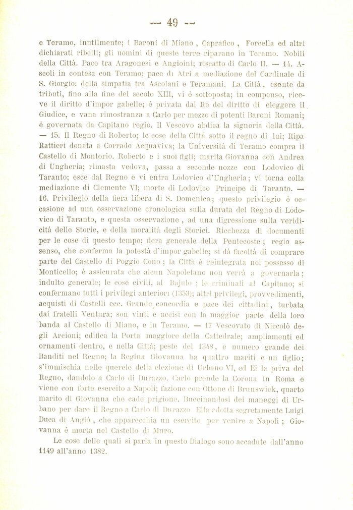 e Teramo, inutilmente; i Baroni di Miano , Caprafico , Forcella ed altri dichiarati ribelli; gli uomini di queste terre riparano in Teramo. Nobili della Città. Pace tra Aragonesi e Angioini; riscatto eli Carlo II. li. A-scoli in contesa con Teramo; pace di Atri a mediazione elei Cardinale di S. Giorgio: della simpatia tra Ascolani e Teramani. La Città, esente da tributi, lino alla line elei secolo XIII, vi ó sottoposta; in compenso, riceve il diritto el'impor gabelle; è privata dal Re elei diritto eli eleggere il Giudice, e vana rimostranza a Carlo per mezzo eli potenti Baroni Romani; é governata da Capitano regio. Il Vescovo abdica la signoria della Città. 15. Il Regno eli Roberto; le coso della Città sotto il regno di lui; Ripa Rattieri donata a Corrado Acquaviva; la Università eli Teramo compra il Castello di Molitorio. Roberto e i suoi Agli; marita Giovanna con Andrea di Ungheria; rimasta vedova, passa a seconde nozze con Lodovico di Taranto; esce dal Regno e vi entra Lodovico d'Ungheria ; vi torna colla mediazione eli Clemente VI; morte eli Lodovico Principe di Taranto. 16. Privilegio eiella liera libera di S. Domenico; questo privilegio è occasione ad una osservazione cronologica sulla durata del Regno eli. Lodovico eli Taranto, e questa osservazione , ad una digressione sulla veridicità delle Storie, e della moralità degli Storici. Ricchezza di documenti per le cose di questo tempo; llera generale della Pentecoste ; regio assenso, che conferma la potestà el'impor gabelle; si dà facoltà di comprare parte del Castello di Poggio Cono ; la Città è reintegrata nel possesso di Monticelli); é assicurata che alcun Napoletano non verrà a governarla; indulto generale; le cose civili, al Bajulo ; le criminali al Capitano; si confermano tutti i privilegi anteriori (1353); altri privilegi, provvedimenti, acquisti di Castelli ecc. Grande concordia e pace dei cittadini, turbata dai fratelli Ventura; son vinti e uccisi con la maggior parte della loro banda al Castello di Miano, e in Teramo. 17 Vescovato di Niccolò degli Arcioni; edifica la Porta maggiore della Cattedrale; ampliamenti ed ornamenti dentro, e nella Città; peste del 1348, e numero grande elei Banditi nel Regno; la Regina Giovanna ha quattro mariti e un figlio; s'immischia nelle querele della elezione di Urbano VI, ed Ei la priva del Regno, dandolo a Carlo di Durazzo. Carlo prende la Corona in Roma e viene con forte esercito a Napoli; fazione con Ottone eli Brunswick, quarto marito eli Giovanna che cade prigione. Buccinandosi dei maneggi di Urbano per dare il Regno a Carlo di Durazzo lilla ? dotta segretamente Luigi Duca eli Angiò , che apparecchia un esercito per venire a Napoli ; Giovanna ó morta nel Castello di. Muro.