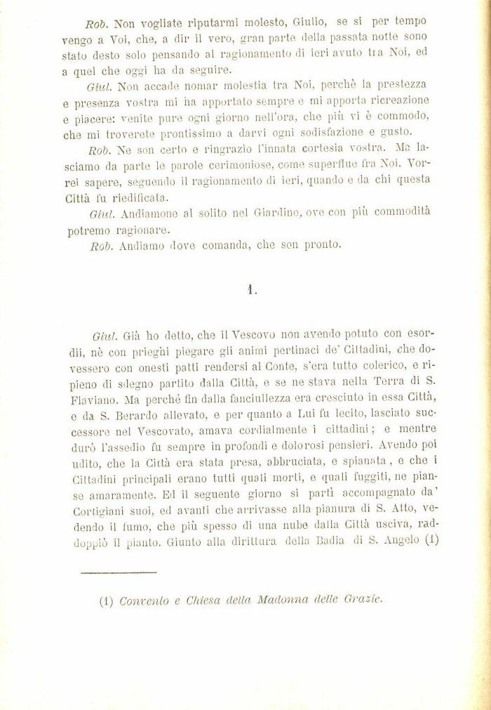 Rob. Ne son certo e ringrazio l'innata cortesia vostra. Ma lasciamo da parte le parole cerimoniose, come superflue fra Noi. Vorrei sapere, seguendo il ragionamento di ieri, quando e da chi questa Città fu riedificata.