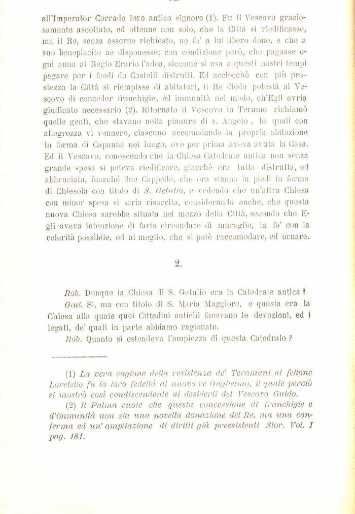 all'Imperator Corrado loro antico signore (1). Fu il Vescovo graziosamente ascoltato, ed ottenne non solo, che la Città si riedificasse, ma il Re, senza esserne richiesto, ne fe' a lui libero dono, e che a suo beneplacito ne disponesse; con condizione però, che pagasse o-gni anno al Regio Erario l'adoa, siccome si usa a questi nostri tempi pagare per i feodi de Castelli distrutti. Ed acciocché con più prestezza la Città si riempisse di abitatori, il Re diede potestà al Vescovo di conceder franchigie, ed immunità nel modo, ch'Egli avria giudicato necessario (2). Ritornato il Vescovo in Teramo richiamò quelle genti, che stavano nella pianura di s. Angelo , le quali con allegrezza vi vennero, ciascuno accomodando la propria abitazione in forma di Capanna nel luogo, ove per prima aveva avuta la Casa. Ed il Vescovo, conoscendo che la Chiesa Catedrale antica non senza grande spesa si poteva riedificare, giacché era tutta distrutta, ed abbruciata, fuorché due Cappelle, che ora stanno in piedi in forma di Chiesola con titolo di S. Gelulio, e vedendo che un'altra Chiesa con minor spesa si saria risarcita, considerando anche, che questa nuova Chiesa sarebbe situata nel mozzo della Città, secondo che figli aveva intenzione di farla circondare di muraglie, la fe' con la celerità possibile, ed al meglio, che si potè raccomodare, ed ornare.