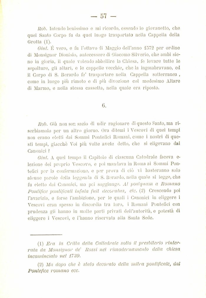 Giul. É vero, e fu l'ottavo di Maggio dell'anno 1572 per ordine di Monsignor Dionisio, antecessore di Giacomo Silverio, che ambi sie-no in gloria, il quale volendo abbellire la Chiesa, fe levare tutte le sepolture, gli altari, e le cappelle vecchie, che la ingombravano, ed il Corpo di S. Berardo fe' trasportare nella Cappella sotterranea , come in luogo più rimoto e di più divozione col medesimo Altare di Marmo, e nella stessa cassetla, nella quale era riposto.
