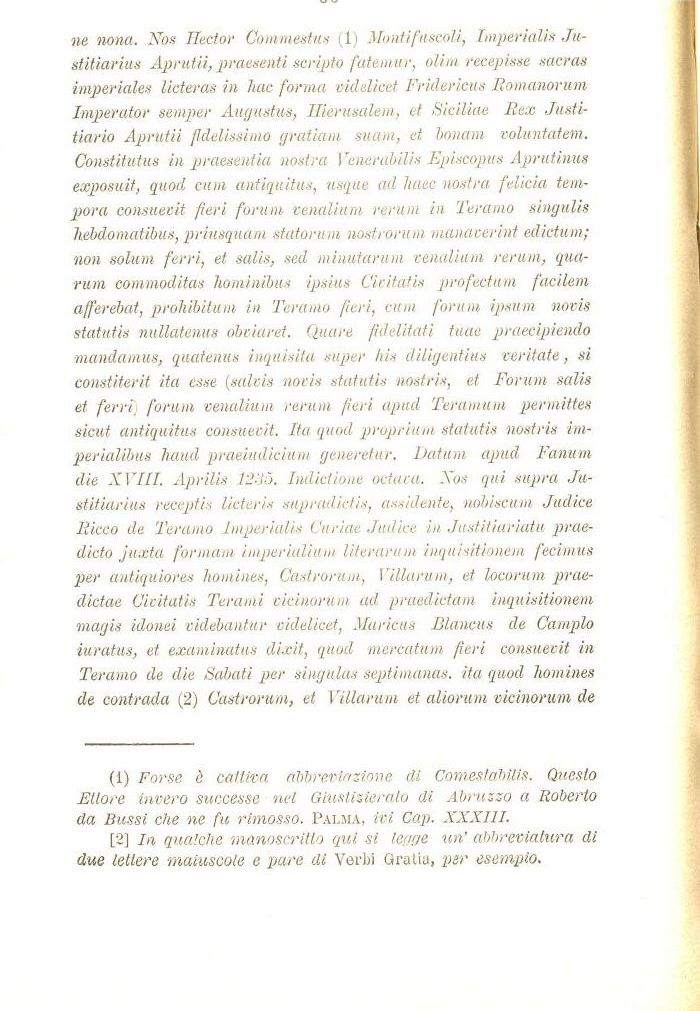 ne nona. Nos Hector Commestus (1) Montifuscoli, Imperialis Ju-stitiarius Aprutii, praesenti scripto f'atemur, olim recepisse sacras imperiales licteras in hac forma videlicet Fridericus Romanorum Imperator semper Augustus, Hierusalem, et Siciliae Rex Justi-tiario Aprutii fldelissimo gratiam suam, et bonam voluntatem. Constitutus in praesentia nostra Venerabilis Episcopus Aprutinus exposuit, quod cum antiquitus, usque ad haec nostra felicia tempora consuevit fieri forum venalium rerum in Teramo singulis hebdomatibus, priusquam statorum nostrorum manaverint edictum; non solum ferri, et salis, sed minutarum venalium rerum, quartini commoditas Jiominibus ipsius Civitatis profectum facilem afferebat, prohibitum in Teramo fieri, cum forum ipsum novis statutis nullatenus obviaret. Quare fidelitati tuae praecipiendo mandamus, quatenus inquisita super his cliligentius ventate, si constiterit ita esse {salvis novis statutis nostris, et Forum salis et ferri) forum venalium rerum fieri apud Teramum permittes sicut antiquitus consuevit. Ita quod proprium statutis nostris im-perialibus haud praeiudicium generetur. Datum apud Fanum die XVIII. Aprilis 1235. Indictione octava. Xos qui supra Just it iarius receptis licteris supradictis, assidente, nobiscum Judice Ricco de Teramo Imperialis Curiae Judice in Justitiariatu prae-dicto juxta for mani imper ialini n liter arum inquisitionem feeimus per antiquiores homines, Castrorum, Villani m, et locorum prae-dictae Civitatis Tarami vicinorum ad praedictam inquisitionem magis idonei videbantur videlicet, Märiens Blancus de Camplo iuratus, et examinatus dixit, quod mercatura fieri consuevit in Teramo de die Sabati per singulas septimanas. ita quod homines de contrada (2) Castrorum, et Villarum et aliorum vicinorum de