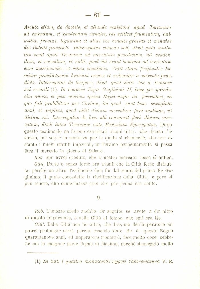 Asculo etiam, de Spoleto, et aliunde veniébant apud Teramum ad emendum, et vendendum venules, res scilicet frumentum, ani-malia, fructus, legumina et alias res venules grossas et minutas die Sabati praedicto. Interrogatus comodo scit, dixit quia multo-ties venit apud Teramum ad mercatum praedictum, ad vendendum, et emendum, et vidit, quoil ibi erant homines ad mercatum cum mercimoniis, et rebus venalibus. Vidit etiam frequenter homines praedictorum locorum euntes et redeuntes a mercatu praedicto. Interrogatus de tempore, dixit quod vidit hoc a tempore sui recordi (1). In tempore Regis Guglielmi II, bene per quinde-cim annos, et post mortem ipsius Regis usque ad presenterei, in quo fuit prohibitum per Curiam, ita quod sunt bene sexaginta anni, et amplius, quod vidit dictum mercatum fieri continue, ut dictum est. Interrogatus de loco ubi cousuevit fieri dictum mercatum, dixit intus Teramum ante Ecclesiam Episcopatus. Dopo questo testimonio ne furono esaminati alcuni altri, che dicono l'i-stesso, poi segue la sentenza per la quale si riconcede, che non o-stante i nuovi statuti imperiali, in Teramo perpetuamente si possa fare il mercato in giorno di Sabato.