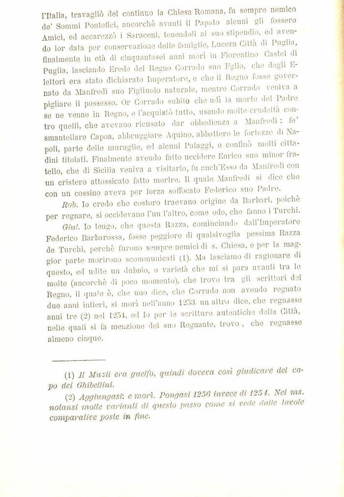 Giul. Io tengo, che questa Razza, cominciando dall'Imperatore Federico Barbarossa, fosse peggiore di qualsivoglia pessima Razza de Turchi, perchè furono sempre nemici di s. Chiesa, e per la maggior parte morirono scommunicati (1). Ma lasciamo di ragionare di questo, ed udite un dubcio, o varietà che mi si para avanti tra le molte (ancorché di poco momento), che trovo Ira gli scrittori del Regno, il quale è, che uno dice, che Corrado non avendo regnato due anni intieri, si morì nell'anno 1253. un altro dice, che regnasse anni tre (2) nel 1254, ed Io per le scritture autentiche della Città, nelle quali si fa menzione dei suo Regnante, trovo , che regnasse almeno cinque.