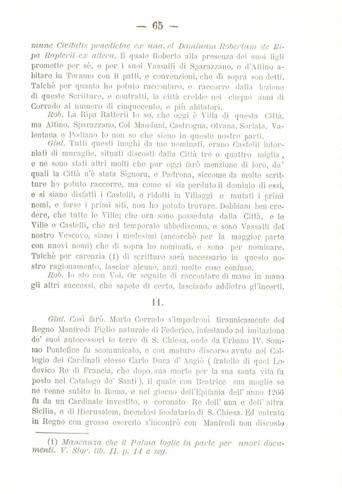 mune Civitatis praediciae ex una. et, Dominimi Robert uni de Ripa Rapterii ex altera. II quale Roberto alla presenza dei suoi figli promette per sè, e per i suoi Vassalli di Sparazzano, e d'Aitino a-bitare in Teramo con li patti, e convenzioni, che di sopra son detti. Talché per quanto ho potuto raccontare, e raccòrrò dalla lozione di queste Scritture, e contratti, la città crebbe nei cinque anni di Corrado al numero di cinquecento, e più abitatori.