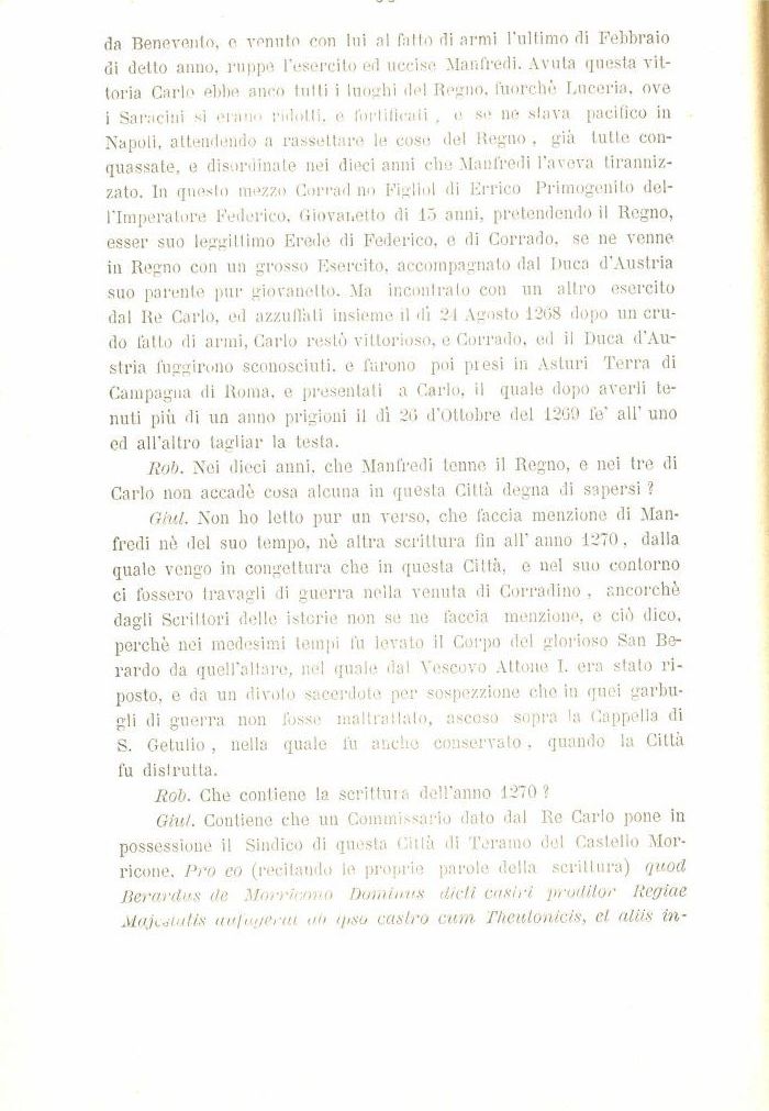 Giul. Non ho letto pur un verso, che faccia menzione di Manfredi nò del suo tempo, nò altra scrittura fin all' anno 1270, dalla quale vengo in congettura che in questa Città, e nel suo contorno ci fossero travagli di guerra nella venuta di Corradino , ancorché dagli Scrittori delle istorie non se ne faccia menzione, e ciò dico, perché nei medesimi tempi fu levato il Corpo del glorioso San Berardo da quell'altare, nel quale dal Vescovo Aitone I. era stalo riposto, e da un divoto sacerdote per sospezzione che in quei garbugli di guerra non fosse maltrattalo, ascoso sopra la Cappella di S. Getulio , nella quale fu anche conservato , quando la Città fu distrutta.