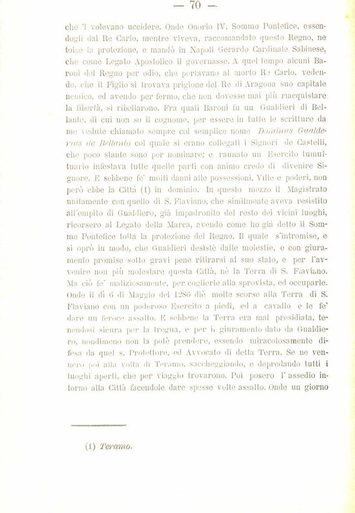 che '1 volevano uccidere. Onde Onorio IV. Sommo Pontefice, essendogli dal Re Carlo, mentre viveva, raccomandato questo Regno, ne tolse la protezione, e mandò in Napoli Gerardo Cardinale Sabinese, che come Legato Apostolico il governasse. A quel tempo alcuni Baroni del Regno per odio, che portavano al morto R ; Carlo, vedendo, che il Figlio si trovava prigione del Re di Aragona suo capitale nemico, ed avendo per fermo, che non dovesse mai più riacquistare la libertà, si ribellarono. Fra quali Baroni fu un Gualdieri di Bel-lante, di cui non so il cognome, per essere in tutte le scritture da nio vedute chiamato sempre col semplice nome Dominus Gualde-rrus de Beliamo col quale si erano collegati i Signori de Castelli, che poco stante sono per nominare; e raunato un Esercito tumultuario infestava tutte quelle parti con animo credo di divenire Signore. E sebbene fé' molti danni alle possessioni, Ville e poderi, non però ebbe la Città (1) in dominio. In questo mezzo il Magistrato unitamente con quello di S. Flaviano, che similmente aveva resistito all'empito di Gualtiero, già impadronito del resto dei vicini luoghi, ricorsero al Legato della Marca, avendo come ho già detto il Sommo Pontefice tolta la protezione del Regno. Il quale s'intromise, e si oprò in modo, che Gualdieri desistè dalle molestie, e con giuramento promise sotto gravi pene ritirarsi al suo stato, e per l'avvenire non più molestare questa Città, nò la Terra di S. Fiaviano. Ma ciò le' maliziosamente, per coglierle alla sprovista, ed occuparle. Onde il di (i di Maggio del 1280 die molte scorse alla Terra di S. Flaviano con un poderoso Esercito a piedi, ed a cavallo e le fe' dare un feroce assalto, li sebbene la Terra era mal presidiata, tenendosi sicura per la tregua, e per ii giuramento dato da Gualdie-ro, nondimeno non la potè prendere, essendo miracolosamente difesa da quel s. Protettore, ed Avvocato di detta Terra. Se ne vennero poi alla volta di Teramo, saccheggiando, e depredando tutti i luoghi aperti, che per viaggio trovarono. Poi posero 1' assedio intorno alla Città facendole dare spesse volte assalto. Onde un giorno