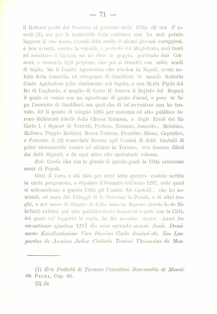 il Rettore posto dal Vescovo al governo della Città, eh' era d' A-scoli (i), ma per la scabrosità della scrittura non ho mai potuto leggere il suo nome, avendo fatta scelta di alcuni giovani coraggiosi, e ben annali, contro la volontà, e proteste del Magistrato, uscì fuori ad assaltare il Campo, ma ne ebbe la peggio, perdendo due Corsieri, e restando Egli prigione, che poi si riscattò con mille scudi di taglia. Ala il Legato Apostolico, che risedea in Napoli, avuta notizia della temerità, ed arroganza di Gualdieri, vi mandò Roberto Conte Agalantese (che similmente col legato, e con Maria Figlia del Re di Ungheria, e moglie di Carlo II. teneva il Bajlato del Regno) il quale ci venne con un squadrone di gente d'armi, e pose in fuga l'esercito di Gualdieri, ma quel che di lui avvenisse non ho trovato. Ed il quinto di Giugno 1280 per sentenza ed atto pubblico furono dichiarati ribelli della Chiesa Romana, e degli Eredi del Re Carlo I. i Signori di Verruti, Podiolo, Tezzano, Joanello, Melatino, Muliano, Poggio Rattieri, Rocca Tonisca, Frontino, Miano, Capratico, e Forcella. E (2) conceduta licenza agli Uomini di detti Castelli di poter sicuramente venire ad abitare in Teramo, ove fossero difesi dai detti Signori, e da ogni altro che molestarli volesse.
