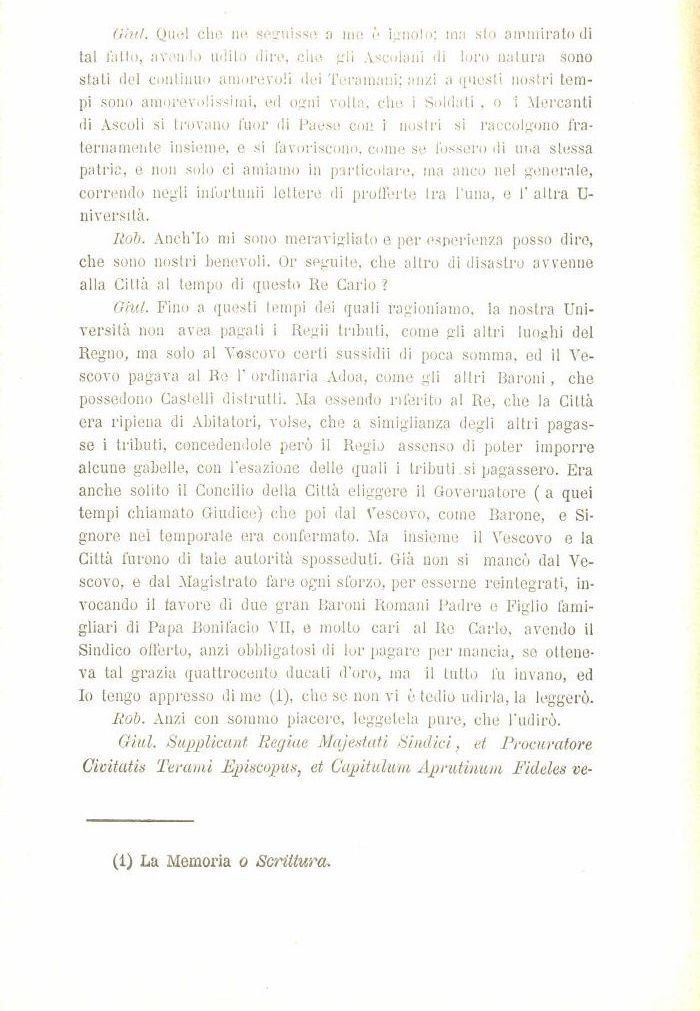Giul. Fino a questi tempi dei quali ragioniamo, la nostra Università non avea pagati i Regii tributi, come gli altri luoghi del Regno, ma solo al Vescovo certi sussidii di poca somma, ed il Vescovo pagava al Re 1' ordinaria Adoa, come gli altri Baroni, che possedono Castelli distrutti. Ma essendo riferito a! Re, che la Città era ripiena di Abitatori, volse, che a simiglianza degli altri pagasse i tributi, concedendole però il Regio assenso di poter imporre alcune gabelle, con l'esazione delle quali i tributi.si pagassero. Era anche solito il Concilio della Città eliggere il Governatore ( a quei tempi chiamato Giudice) che poi dal Vescovo, come Barone, e Signore nel temporale era confermato. Ala insieme il Vescovo e la Città furono di tale autorità sposseduti. Già non si mancò dal Vescovo, e dal Magistrato fare ogni sforzo, per esserne reintegrati, invocando il favore di due gran Baroni Romani Padre e Figlio famigliari di Papa Bonifacio VII, e molto cari al Re Carlo, avendo il Sindico offerto, anzi obbligatosi di lor pagare per mancia, se otteneva tal grazia quattrocento ducati d'oro, ma il tutto fu invano, ed Io tengo appresso dime (i), che se non vi è tedio udirla, la leggerò.