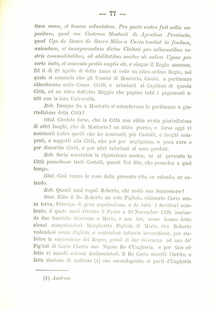 Giul. Ebbe il Re. Roberto un solo Figliolo, chiamato Carlo senza terra, Principe di gran aspettazione, e da tutti i Scrittori celebrato, il quale morì vivente il Padre a 10 Novembre 1828, lasciando due fanciulle Giovanna e Maria, e non tre, come hanno detto alcuni computandoci Margherita Figliola di Maria. Ora Roberto vedendosi senza Figlioli, e sentendosi tuttavia invecchiare, per stabilire la successione del Regno, pensò di dar Giovanna ad uno de' Fig'ioli di Carlo Uberto suo Nipote Re d'Ungheria, e per tale effetto vi mandò solenni Ambasciatori. Il Re Carlo accettò l'invito, e fatta elezione di Andreas (1) suo secondogenito si partì d'Ungheria