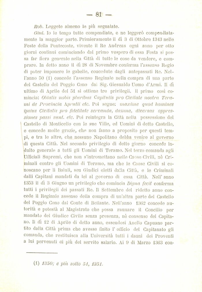 Qiul. Io le tengo tutte compendiate, e ne leggerò compendiata-mente la maggior parte. Primieramente il dì 3 di Ottobre 1343 nelle Feste della Pentecoste, vivente il Re Andreas ogni anno per otto giorni continui cominciando dal primo vespero di essa Festa si possa far fiera generale nella Città di tutte le cose da vendere, e comprare. In detto anno il dì 28 di Novembre conferma l'assenso Regio di poter imponere le gabelle, concedute dagli antepassati Re. Nell'anno 50 (1) concede l'assenso Reginale nella compra di una parte del Castello del Poggio Cono dal Sig. Giesualdo Uomo d'Armi. Il dì ultimo di Aprile del 51 si ottiene tre privilegii, il primo così comincia: Oblatis nobis pluribus Capitulis prò Cimiate nostra Tergami de Provincia kprutii etc. Poi segue: maxime quod homines ipsius Civitatis prò fidetttate serranda, damna, diversas oppres-siones passi sunt. eie. Poi reintegra la Città nella possessione del Castello di Monticelio con le sue Ville, ed Uomini di detto Castello, e concede molte grazie, che non fanno a proposito per questi tempi, e tra le altre, che nessuno Napolitano debba venire al governo di questa Città. Nel secondo privilegio di detto giorno concede indulto generale a tutti gli Uomini di Teramo. Nel terzo comanda agli Ufficiali Supremi, che non s'intromettano nelle Caose Civili, nè Criminali contro gli Uomini di Teramo, ma che le Caose Civili si conoscano per li Baiuli, seu Giudici eletti dalla Città, e le Criminali dalli Capitani mandati da lei al governo di essa Città. Neil' anno 1353 il dì 3 Giugno un privilegio che comincia Digna fecit conferma tutti i privilegii dei passati Re. Il Settembre del ridetto anno concede il Reginale assenso della compra di un'altra parte del Castello del Poggio Cono dal Conte di Bollante. Nell'anno 1362 concede autorità e potestà al Magistrato che possa raunare il Concilio per mandato del Giudice Civile senza presenza, nè consenso del Capitano. Il di 12 di Aprile di detto anno, essendosi Anello Capuano partito dalla Città prima che avesse finito 1' officio del Capitanato gli comanda, che restituisca alla Università tutti i danni dei Proventi a lui pervenuti di più del servito salario. Ai 9 di Marzo 1363 con-