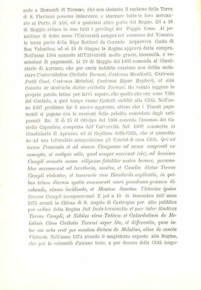cede a Mercanti di Teramo, che non obstante il reclamo della Terra di S. Flaviano possono imbarcare, e sbarcare tutte le loro mercanzie al Porto di Atri, ed a qualsiasi altro porto del Regno. Ed a 28 di Maggio riduce in uno tutti i privilegi del Poggio Cono. Al penultimo di detto mese l'Università compra col consenso del Vescovo la terza parte della Ripa Rattieri da Corrado Acquaviva Conte di San Valentino; ed ai 10 di Giugno la Regina approva detta compra. Nell'anno 1304 concede all'Università molte grazie, immunità, e remissioni di pagamenti. Ai 23 di Maggio del 1365 comanda al Giustiziano di Apruzzo, che per certa indebita esazione non debba molestare Universitatem Civitatis Ter ami, Castrimi Monticelli, Caslrum Podii Coni, C istrum Melalini, castrum Ripae Rapterii, et alia Casalia de destriclu dictae civitatis Terami. Ho voluto leggere le proprie parole latine per farvi sapere, che quelle che ora sono Ville del Contado, a quel tempo erano Castelli sudditi alla Città. Nell'anno 1367 proibisce far il nuovo apprezzo, atteso che i Fiscali pagamenti si pagano con le esazioni delle gabelle, concedute dagli antipassati Re. Il dì 15 di Ottobre del 1368 concede l'assenso del Castello Caprafico, comprato dall' Univervità. Nel 1369 commette al Giustiziano di Apruzzo, ed al Capitano della Città, che si ammettano ad una tollerabile composizione gli Uomini di essa Città. Qui ad vocem Praeconis et ad sonum Camparne ad arma eongreati ex concepto, et antiquo odio, quod semper sexerunt (sic), ad homines Campii armata manu, vilipenso fataliter nostro Tionore, persona-liter accesserunt ad territoria, montes, et Casalia dictae Terrae Campii violenter, et temerarie cum Blanderiis explicatis, in qui-bus trium dierum spatio commorati more praedoneo granum di-robando, vineas incidendo, et Montem Sanctae Victoriae ipsius Terrae Campii occupaverunt. E poi a 10 di Decembre dell' anno 1371 avanti la Chiesa di S. Angelo di Castrogno per atto pubblico per ordine della Regina fuit facta transaclio et pax inter Sindicos Terrae Campii, et Nobiles viros Tutium et Galardutium de Me-latinis Cives Civitatis Terami super lite, et differentia, quae Inter eos orta erat per montem dictum de Melatino, alias de sancta Victoria. Nell'anno 1374 avendo il magistrato esposto alla Regina, che per la solennità d'alcune leste, e per decoro della Città tengo-