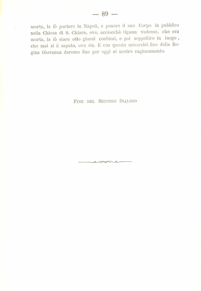 morta, la fè portare in Napoli, e ponere il suo Corpo in pubblico nella Chiesa di S. Chiara, ove, acciocché Ognun vedesse, che era morta, la tè stare otto giorni continui, e poi seppellire in luogo , che mai si è saputo, ove sia. E con questo miserabil fine della Regina Giovanna daremo fine per oggi al nostro ragionamento.