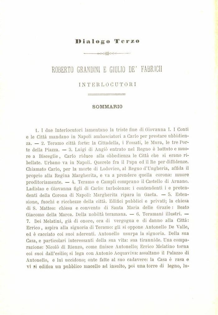 L I due Interlocutori lamentano la triste fine di Giovanna I. I Conti e le Città mandano in Napoli ambasciatori a Carlo per prestare ubbidienza. 2. Teramo città forte: la Cittadella, i Fossati, le Mura, le tre Porte della Piazza. 3. Luigi di Angiò entrato nel Regno è battuto e muore a Bisceglie, Carlo riduce alla obbedienza le Città clie si erano ribellate. Urbano va in Napoli. Querele fra il Papa ed il Re per diffidenze. Chiamato Carlo, per la morte di Lodovico, al Regno d'Ungheria, affida il proprio alla Regina Margherita, e va a prendere quella corona: muore proditoriamente. 4. Teramo e Campii comprano il Castello di Amano. Ladislao e Giovanna figli di Carlo: turbolenze: i contendenti i e pretendenti della Corona di Napoli: Margherita ripara in Gaeta. 5. Estensione, fuochi e ricchezze della città. Edifici pubblici e privati; la chiesa di S. Matteo: chiesa e convento di Santa Maria delle Grazie : Beato Giacomo della Marca. Della nobiltà teramana. 6. Teramani illustri. 7. Dei Melatini, già di onore, ora di vergogna e di danno alla Città: Errico, aspira alla signoria di Teramo: gli si oppone Antonello De Valle, ed é cacciato coi suoi aderenti. Antonello usurpa la signoria. Della sua Casa, e particolari interessanti della sua vita: sua tirannide. Una comparazione: Nicolò di Rienzo, come finisce Antonello; Errico Melatino torna coi suoi dall'esilio; si lega con Antonio Acquaviva: assaltano il Palazzo di Antonello, e lui uccidono; onte fatte al suo cadavere: la Casa è rasa e vi si edifica un pubblico macello ad insulto, poi una torre di legno, lu-