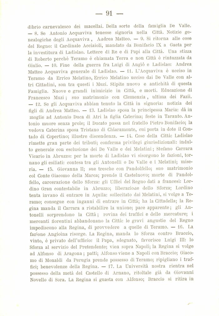 12. Se gli Acquaviva abbian tenuto la Città in signoria: notizia dei figli di Andrea Matteo. 13. Ladislao sposa la principessa Maria: dà in moglie ad Antonio Duca di Atri la figlia Caterina; feste in Taranto. Antonio muore senza prole; il Ducato passa nel fratello Pietro Bonifacio; la vedova Caterina sposa Tristano di Cliiaramonte, cui porta in dote il Contado di Copertino; illustre discendenza. 14. Cose della Città: Ladislao rimette gran parte dei tributi; conferma privilegi giurisdizionali: indulto generale con esclusione dei De Valle e dei Melatini ; Stefano Carrara Vicario in Abruzzo: per la morte di Ladislao vi sisorgono le fazioni, tornano gli esiliati: contesa tra gli Antonella o De Valle e i Melatini; miseria. 15. Giovanna II; sue tresche con Pandolfello; suo matrimonio col Conte Giacomo della Marca; prende il Castelnovo; morte di Pandolfello, carcerazione dello Sforza: gli Uffici del Regno dati a francesi: Lordino Gran contestabile in Abruzzo; liberazione dello Sforza; Lordino tenta invano di entrare in Aquila: sollecitato dai Melatini, si volge a Teramo; consegue con inganni di entrare in Città; ha la Cittadella; la Regina manda il Carrara a ristabilire la unione; pace apparente; gli An-tonelli sorprendono la Città ; rovina dei traffici e delle mercature; i mercanti fiorentini abbandonano la Città: le gravi angustie del Regno impediscono alla Regina, di provvedere a quelle eli Teramo. 16. La fazione Angioina risorge. La Regina, manda lo Sforza contro Braccio, vinto, è privato dell'ufficio: il Papa, sdegnato, favorisce Luigi III: lo Sforza al servizio del Pretendente; vien sopra Napoli; la Regina si volge ad Alfonso di Aragona; patti; Alfonso viene a Napoli con Braccio; Giacomo di Monaldi da Perugia prende possesso di Teramo; ripigliano i traffici; benevolenze della Regina. 17. La Università nostra rientra nel possesso della metà del Castello di Amano, ritoltale già da Giovanni Novello di Sora. La Regina si guasta con Alfonso; Braccio si ritira in