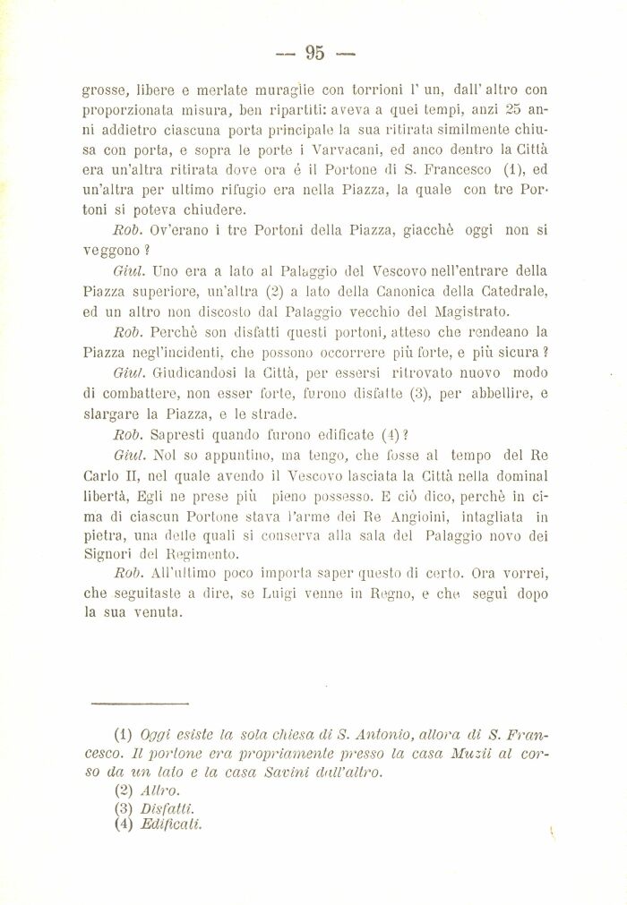 Giul. Noi so appuntino, ma tengo, che fosse al tempo del Re Carlo II, nel quale avendo il Vescovo lasciata la Città nella dominai libertà, Egli ne prese più pieno possesso. E ciò dico, perchè in cima di ciascun Portone stava l'arme dei Re Angioini, intagliata in pietra, una delle quali si conserva alla sala del Palaggio novo dei Signori del Regimentó.
