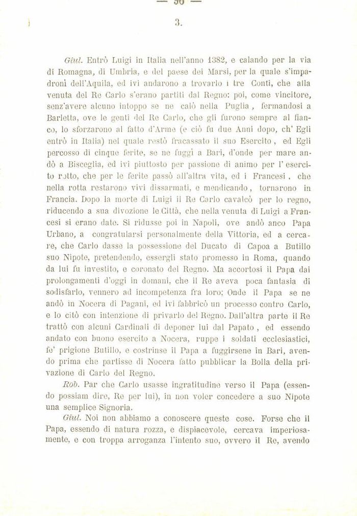 Giul. Entrò Luigi in Italia nell'anno 1382, e calando per la via di Romagna, di Umbria, e del paese dei Marsi, per la quale s'impadronì dell'Aquila, ed ivi andarono a trovarlo 1 tre Conti, che alla venuta del Re Carlo s'erano partiti dal Regno: poi, come vincitore, senz'avere alcuno intoppo se ne calò nella Puglia , fermandosi a Barletta, ove le genti del Re Carlo, che gli furono sempre al flanco, lo sforzarono al fatto d'Arme (e ciò fu due Anni dopo, eh' Egli entrò in Italia) nel quale restò fracassato il suo Esercito , ed Egli percosso di cinque ferite, se ne fuggi a Bari, d'onde per mare andò a Bisceglia, ed ivi piuttosto per passione di animo per 1' esercito rotto, che per le ferite passò all'altra vita, ed i Francesi , che nella rotta restarono vivi dissarmati, e mendicando, tornarono in Francia. Dopo la morte di Luigi il Re Carlo cavalcò per lo regno, riducendo a sua divozione le Città, che nella venuta di Luigi a Francesi si erano date. Si ridusse poi in Napoli, ove andò anco Papa Urbano, a congratularsi personalmente della Vittoria, ed a cercare, che Carlo dasse la possessione del Ducato di Capoa a Butillo suo Nipote, pretendendo, essergli stato promesso in Roma, quando da lui fu investito, e coronato del Regno. Ma accortosi il Papa dai prolongamenti d'oggi in domani, che il Re aveva poca fantasia di sodisfarlo, vennero ad incompetenza fra loro; Onde il Papa se ne andò in Nocera di Pagani, ed ivi fabbricò un processo contro Carlo, e lo citò con intenzione di privarlo del Regno. Dall'altra parte il Re trattò con alcuni Cardinali di deponer lui dal Papato , ed essendo andato con buono esercito a Nocera, ruppe i soldati ecclesiastici, fe' prigione Butillo, e costrinse il Papa a fuggirsene in Bari, avendo prima che partisse di Nocera fatto pubblicar la Bolla della privazione di Carlo del Regno.