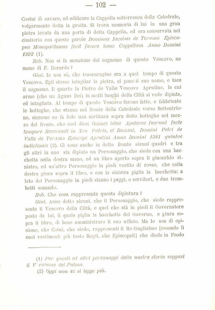 Gìul. Io non sé, che trascuragine era a quel tempo di questo Vescovo, Egli stesso intagliar la pietra, ci pone il suo nome, e tace il cognome. Il quarto fu Pietro de Valle Vescovo Aprutino, la cui arme (che un Agnus Dei) in molti luoghi della Città si vede dipinta, ed intagliata. Al tempo di questo Vescovo furono fatte, e fabbricate le botteghe, che stanno nel fronte della Catedrale verso Settentrione, siccome ne fa fede una scrittura sopra dette botteghe nel mezzo del fronte, che così dice: Omnes Mae Apotecae fuerunt facte tempore Reverendi in Xro Patris, et Domini, Domini Petri de Valle de Teramo Episcopi Aprutinì Anno Domini 1381 quintae indictionis (2). Ci sono anche in detto fronte alcuni quadri e tra gli altri in uno sta dipinto un Personaggio, che siede con una bacchetta nella destra mano, ed un libro aperto sopra il ginocchio si. nistro, ed un'altro Personaggio in piedi vestito di rosso, che colla destra giura sopra il libro, e con la sinistra piglia la bacchetta: a lato del Personaggio in piedi stanno i paggi, e servitori, e due trombetti sonando.