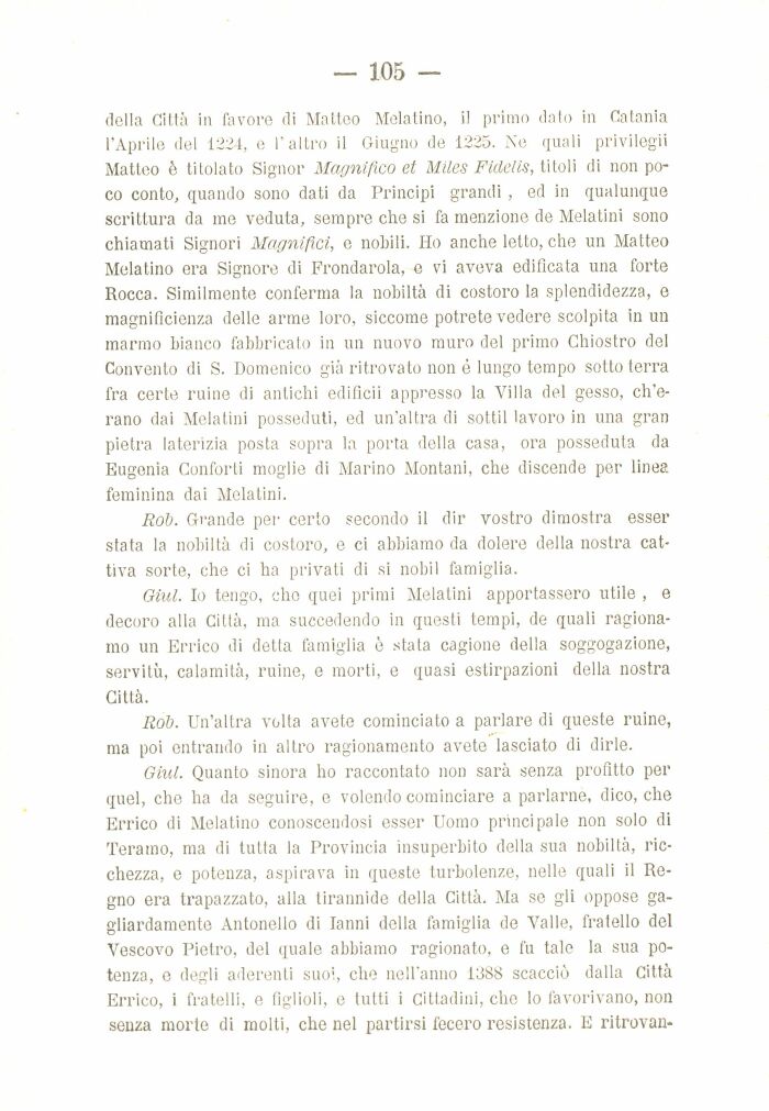 Giul. Quanto sinora ho raccontato non sarà senza profitto per quel, che ha da seguire, e volendo cominciare a parlarne, dico, che Errico di Melatino conoscendosi esser Uomo principale non solo di Teramo, ma di tutta la Provincia insuperbito della sua nobiltà, ricchezza, e potenza, aspirava in queste turbolenze, nelle quali il Regno era trapazzato, alla tirannide della Città. Ma se gli oppose gagliardamente Antonello di Ianni della famiglia de Valle, fratello del Vescovo Pietro, del quale abbiamo ragionato, e fu tale la sua potenza, e degli aderenti suoi, che nell'anno 1388 scacciò dalla Città Errico, i fratelli, e figlioli, e tutti i Cittadini, che lo favorivano, non senza morte di molti, che nel partirsi fecero resistenza. E ritrovali-