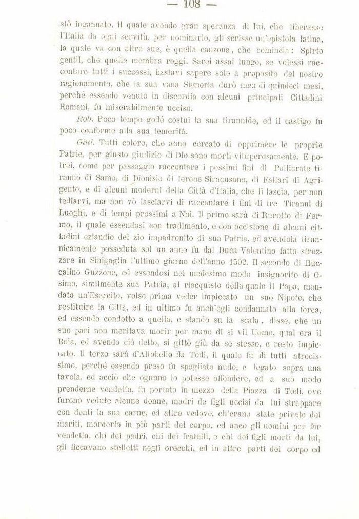 Giul. Tutti coloro, che anno cercato di opprimere le proprie Patrie, per giusto giudizio di Dio sono morti vituperosamente. E potrei, come per passaggio raccontare i pessimi fini di Pollicrate tiranno di Samo, di Dionisio di Ierone Siracusano, di Fallari di Agrigento, e di alcuni moderni della Città d'Italia, che li lascio, per non tediarvi, ma non vò lasciarvi di raccontare i fini di tre Tiranni di Luoghi, e di tempi prossimi a Noi. H primo sarà di Rurotto di Fermo, il quale essendosi con tradimento, e con occisione di alcuni cittadini eziandio del zio impadronito di sua Patria, ed avendola tirannicamente posseduta sol un anno fu dal Duca Valentino fatto strozzare in Sinigaglia l'ultimo giorno dell'anno 1502. Il secondo di Buc-calino Guzzone, ed essendosi nel medesimo modo insignorito di 0-simo, similmente sua Patria, al riacquisto della qnale il Papa, mandato un'Esercito, volse prima veder impiccato un suo Nipote, che restituire la Città, ed in ultimo fu anch'egli condannato alla forca, ed essendo condotto a quella, e stando su la scala, disse, che un suo pari non meritava morir per mano di si vii Uomo, qual era il Boia, ed avendo ciò detto, si gittò giù da se stesso, e resto impiccato. Il terzo sarà d'Altobello da Todi, il quale fu di tutti atrocissimo, perché essendo preso fu spogliato nudo, e legato sopra una tavola, ed acciò che ognuno lo potesse offendere, ed a suo modo prenderne vendetta, fu portato in mezzo della Piazza di Todi, ove furono vedute alcune donne, madri de figli uccisi da lui strappare con denti la sua carne, ed altre vedove, ch'erano state private dei mariti, morderlo in più parti del corpo, ed anco gli uomini per far vendetta, chi dei padri, chi dei fratelli, e chi dei figli morti da lui, gli ficcavano stelletti negli orecchi, ed in altre parti del corpo ed
