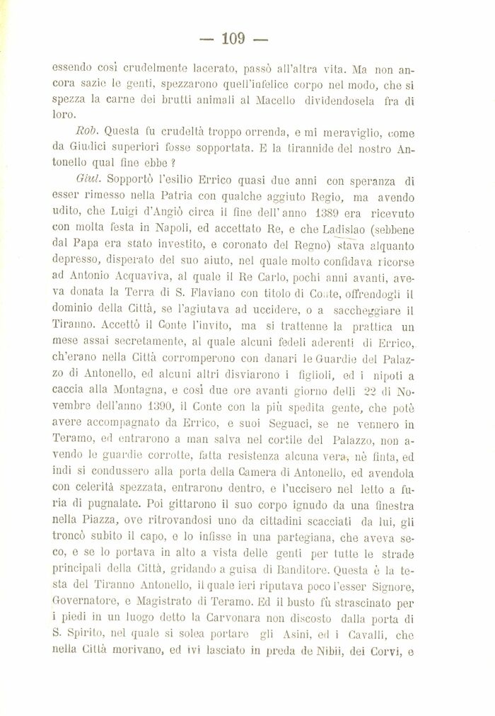 Giul. Sopportò l'esilio Errico quasi due anni con speranza di esser rimesso nella Patria con qualche aggiuto Regio, ma avendo udito, che Luigi d'Angiò circa il fine dell'anno 1389 era ricevuto con molta festa in Napoli, ed accettato Re, e che Ladislao (sebbene dal Papa era stato investito, e coronato del Regno) stava alquanto depresso, disperato del suo aiuto, nel quale molto confidava ricorse ad Antonio Acquaviva, al quale il Re Carlo, pochi anni avanti, aveva donata la Terra di S. Plaviano con titolo di Conte, offrendogli il dominio della Città, se l'agiutava ad uccidere, o a saccheggiare il Tiranno. Accettò il Conte l'invito, ma si trattenne la prattica un mese assai secretamente, al quale alcuni fedeli aderenti di Errico, ch'erano nella Citlà corromperono con danari le Guardie del Palazzo di Antonello, ed alcuni altri disviarono i figlioli, ed i nipoti a caccia alla Montagna, e così due ore avanti giorno delli 22 di Novembre dell'anno 1390, il Conte con la più spedita gente, che potè avere accompagnato da Errico, e suoi Seguaci, se ne vennero in Teramo, ed entrarono a man salva nel cortile del Palazzo, non a-vendo le guardie corrotte, fatta resistenza alcuna vera, nè finta, ed indi si condussero alla porta della Camera di Antonello, ed avendola con celerità spezzata, entrarono dentro, e l'uccisero nel letto a furia di pugnalate. Poi gittarono il suo corpo ignudo da una finestra nella Piazza, ove ritrovandosi uno da cittadini scacciati da lui, gli troncò subito il capo, e lo infisse in una partegiana, che aveva seco, e se lo portava in alto a vista delle genti per tutte le strade principali della Città, gridando a guisa di Banditore. Questa è la testa del Tiranno Antonello, il quale ieri riputava poco l'esser Signore, Governatore, e Magistrato di Teramo. Ed il busto fù strascinato per i piedi in un luogo detto la Carvonara non discosto dalla porta di S. Spirito, nel quale si solea portare gli Asini, ed i Cavalli, che nella Citlà morivano, ed ivi lascialo in preda de Nibii, dei Corvi, e