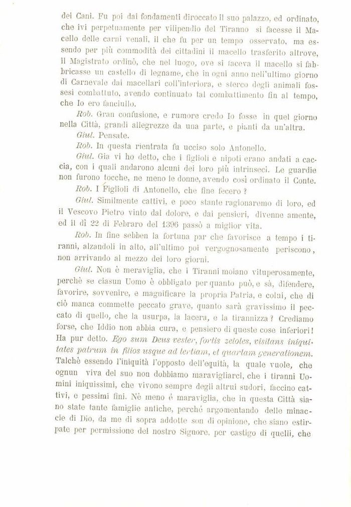 Giul. Non è meraviglia, che i Tiranni moiano vituperosamente, perchè se ciasun Uomo è obbligato per quanto può, e sà, difendere, favorire, sovvenire, e magnificare la propria Patria, e colui, che di ciò manca commette peccato grave, quanto sarà gravissimo il peccato di quello, che la usurpa, la lacera, e la tirannizza ? Crediamo forse, che Iddio non abbia cura, e pensiero di queste cose inferiori! Ha pur detto. Ego sum Deus vester, forlis zelotes, visitans iniqui-tates patrurn in fìlios usque ad tertiam, et quartam generationern. Talché essendo l'iniquità l'opposto dell'equità, la quale vuole, che ognun viva del suo non dobbiamo maravigliarci, che i tiranni Uomini iniquissimi, che vivono sempre degli altrui sudori, faccino cattivi, e pessimi fini. Né meno é maraviglia,, che in questa Città siano state tante famiglie anliche, perché argomentando delle minac-cie di Dio, da me di sopra addotte son di opinione, che siano estirpate per permissione del nostro Signore, per castigo di quelli, che