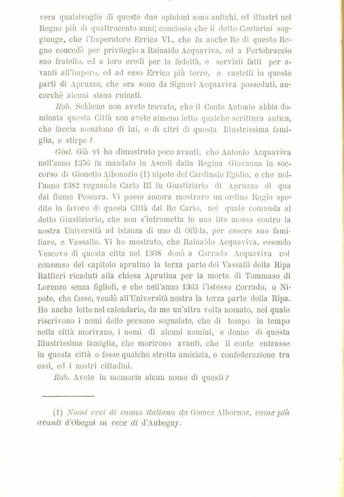 Giul. Già vi ho dimostrato poco avanti, che Antonio Acquaviva nell'anno 1356 fu mandato in Ascoli dalla Regina Giovanna in soccorso dì Gionetio Albonozio (1) nipote del Cardinale Egidio, e che nell'anno 1382 regnando Carlo III fu Giustiziano di Apruzzo di qua dal fiume Pescara. Vi posso ancora mostrare un ordine Regio spedito in favore di questa Città dal Re Carlo, nel quale comanda al detto Giustiziano, che non s'intrometta in una lite mossa contro la nostra Università ad istanza di uno di Offida, per essere suo familiare, e Vassallo. Vi ho mostrato, che Rainaldo Acquaviva, essendo Vescovo di questa città nel 1308 donò a Corrado Acquaviva col consenso del capitolo aprutino la terza parte dei Vassalli della Ripa Rattieri ricaduti alla chiesa Aprutina per la morte di Tommaso di Lorenzo senza figlioli, e che nell'anno 1363 l'istesso Corrado, o Nipote, che fosse, vendè all'Università nostra la terza parte della Ripa. Ho anche letto nel calendario, da me un'altra volta nomato, nel quale riscrivono i nomi delle persone segnalate, che di tempo in tempo nella città morivano, i nomi di alcuni uomini, e donne di questa Illustrissima famiglia, che morirono avanti, che il conte entrasse in questa città o fosse qualche stretta amicizia, e confederazione tra essi, ed i nostri cittadini.